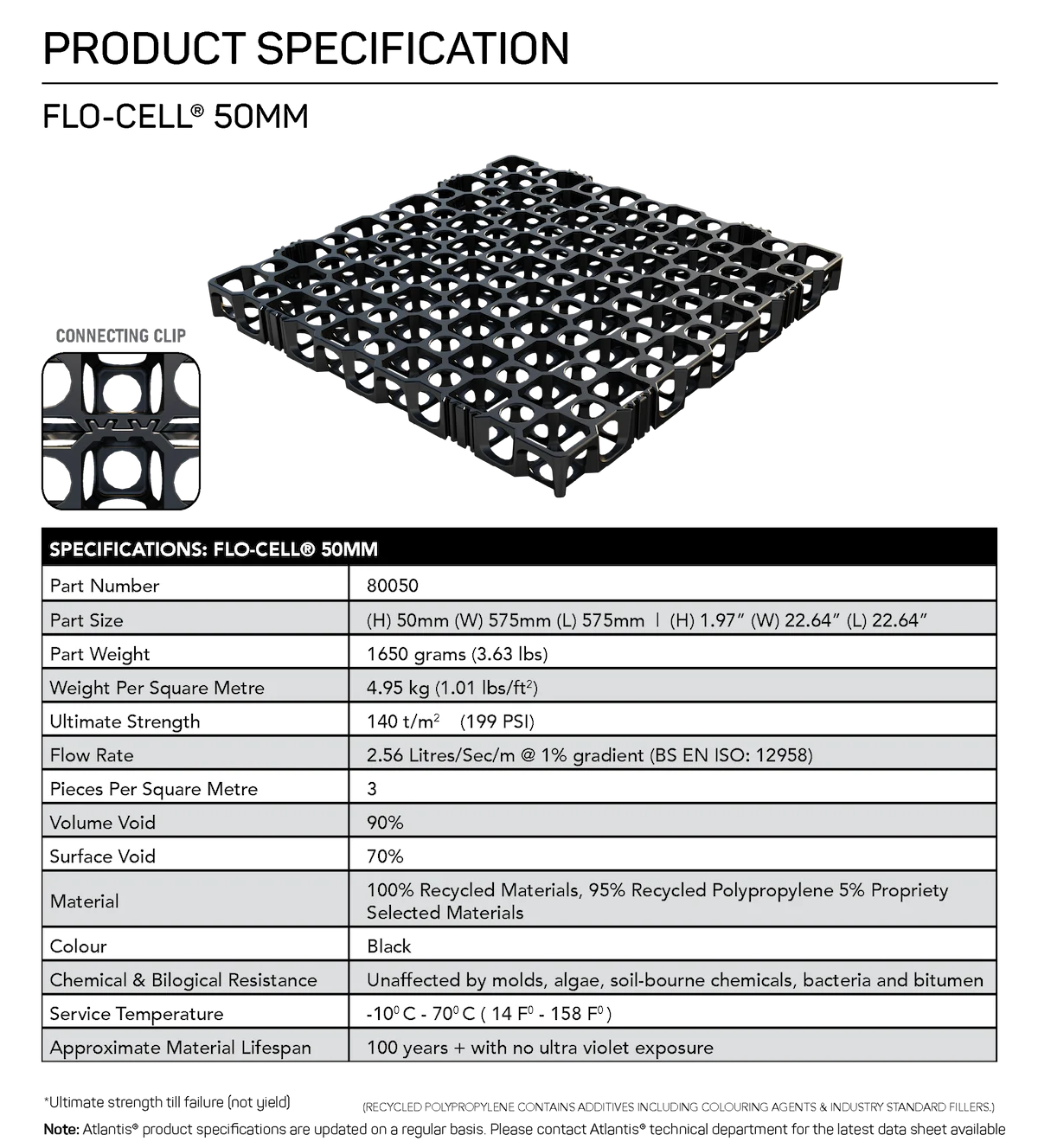 | Superior Drainage Panel for Efficient Water Management | The Atlantis Flo-Cell® 50mm drainage panel ensures rapid water removal and groundwater recharge with its high infiltration rate and 90% void ratio. This innovative drainage panel excels in Water Sensitive Urban Design (WSUD) applications, effectively reducing overland flow and increasing the permeability of ground areas. |