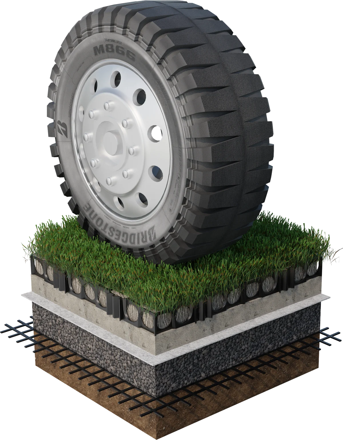 Turf Cell® is the ideal solution for reinforcing lawns in areas with vehicle traffic. Its robust design ensures long life and meets most traffic requirements for low to medium duty locations, with an installed load capacity of 4,000 tons per square meter. Vehicles passing over the lawn do not damage the roots, as they are well-protected by the Turf Cell® structure.