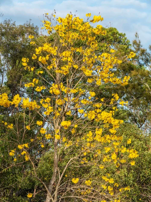 Copperpod (Yellow flame tree) suitable for Saudi landscapes; medium water use once established, best in full sun. Typical mature size 12-20 m tall.